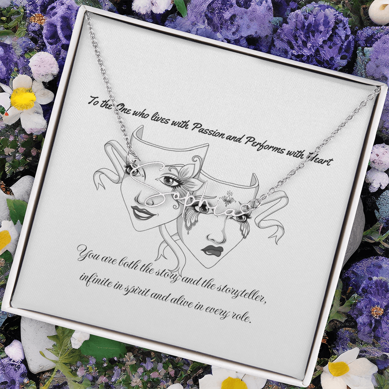 Custom Drama Mask Name Necklace – Theatre Lover Gift – Tragedy & Comedy Pendant – Personalized Stainless Steel or 18K Gold Jewelry
