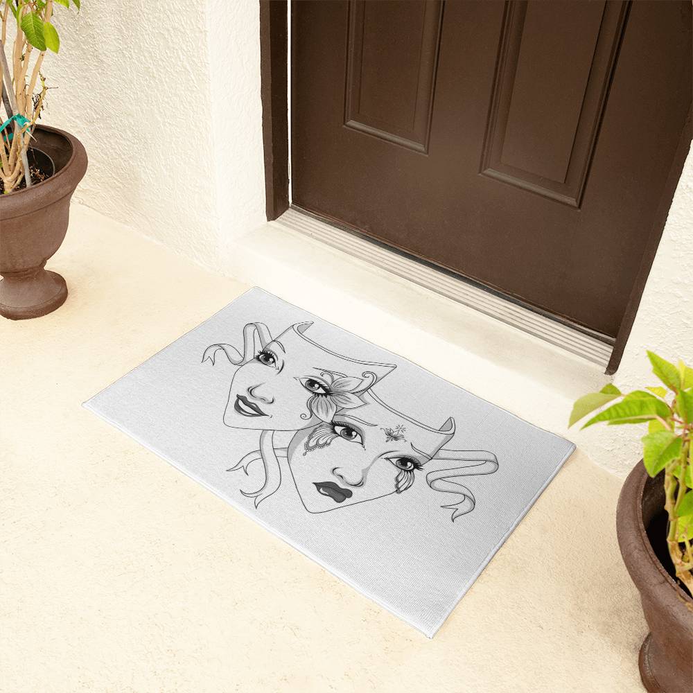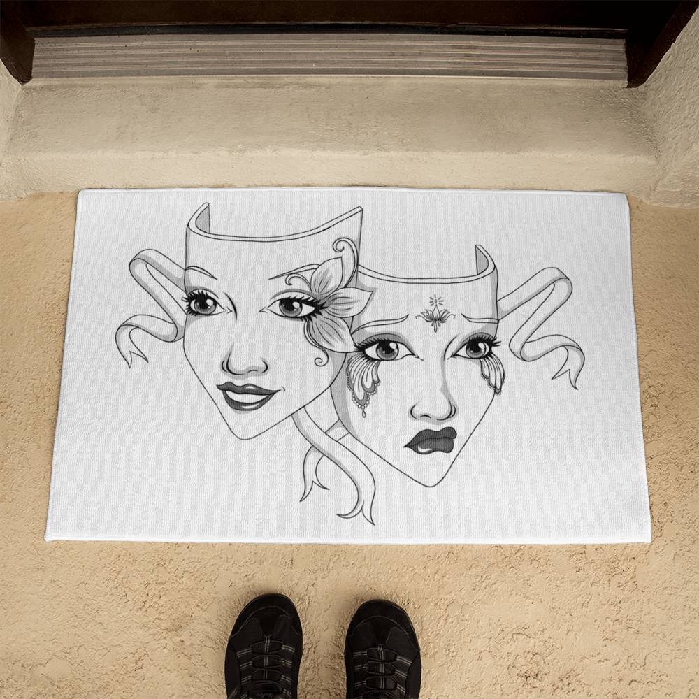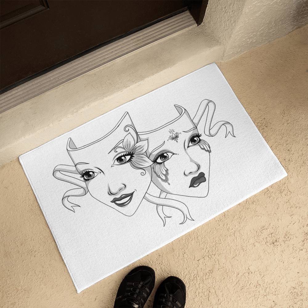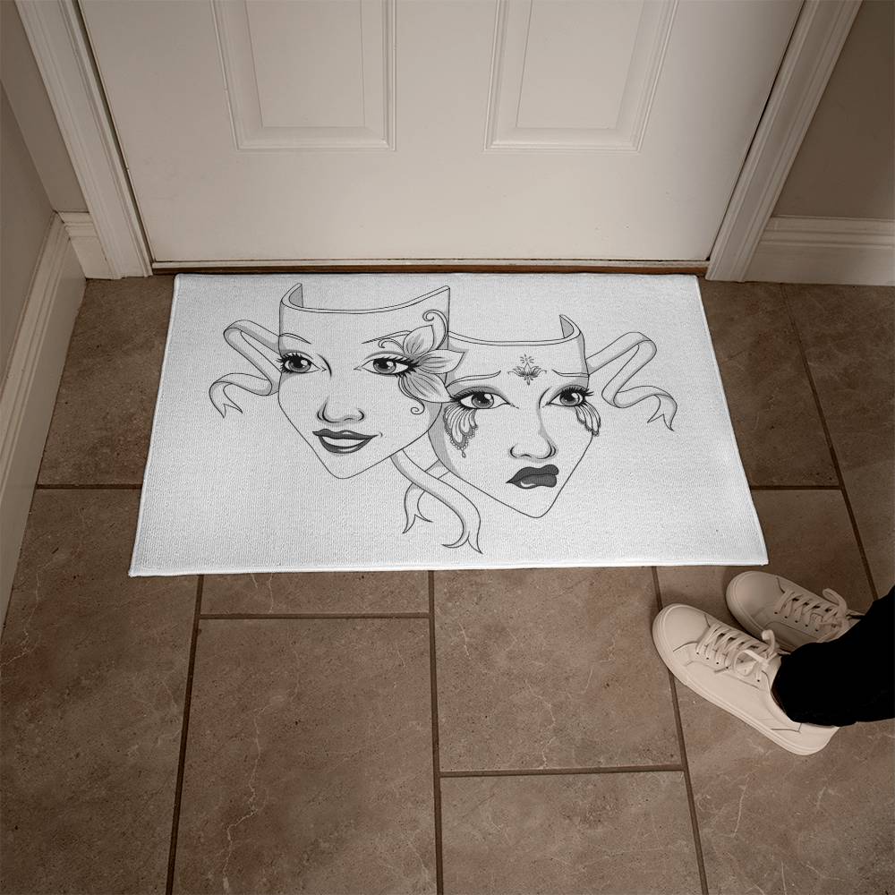 Make your grand entrance unforgettable with our Drama Mask Welcome Mat, inspired by the duality of theatre—the joy and sorrow that lives within every performer. This bold, hand-illustrated design features the timeless comedy and tragedy masks, elevated with feminine, gothic detailing and a clean black-and-white palette.