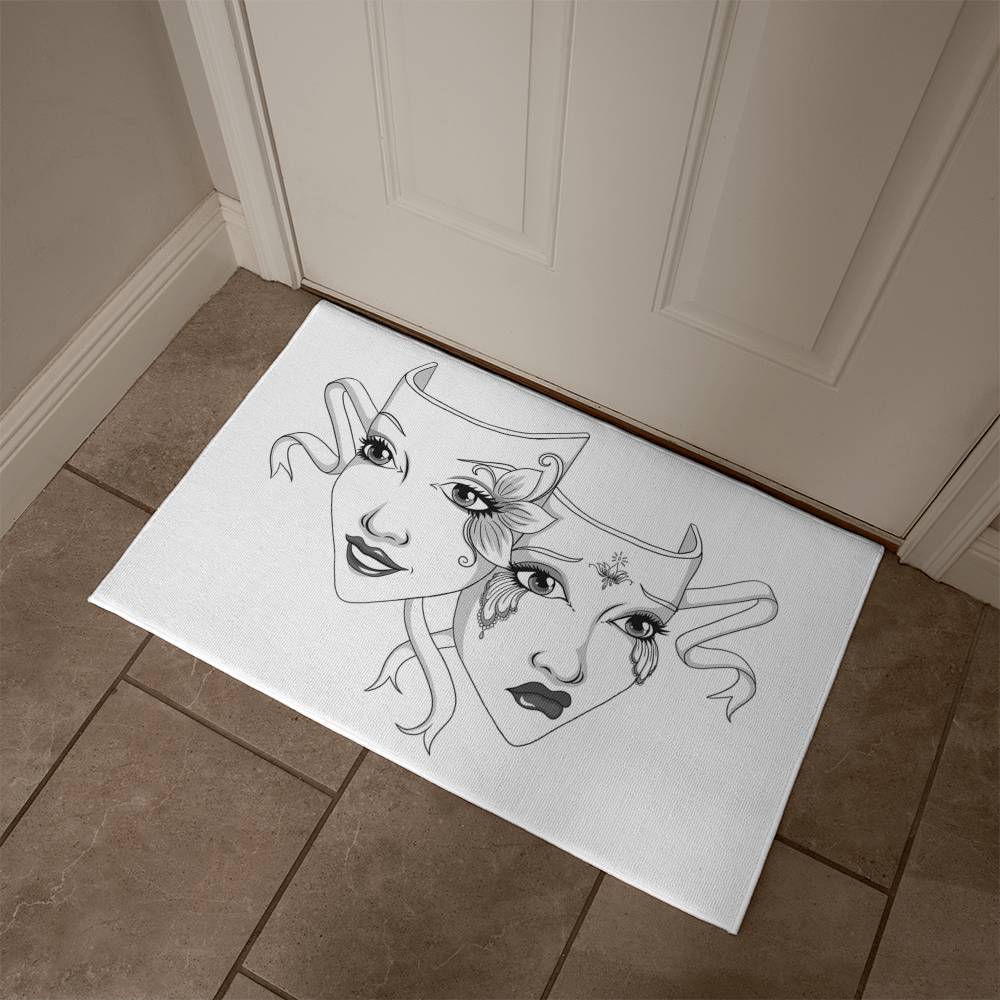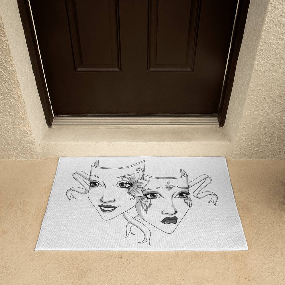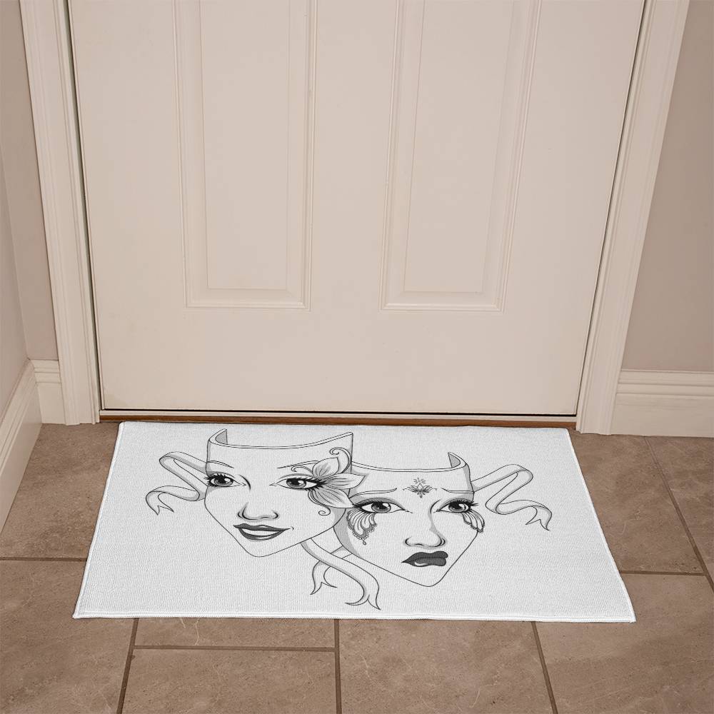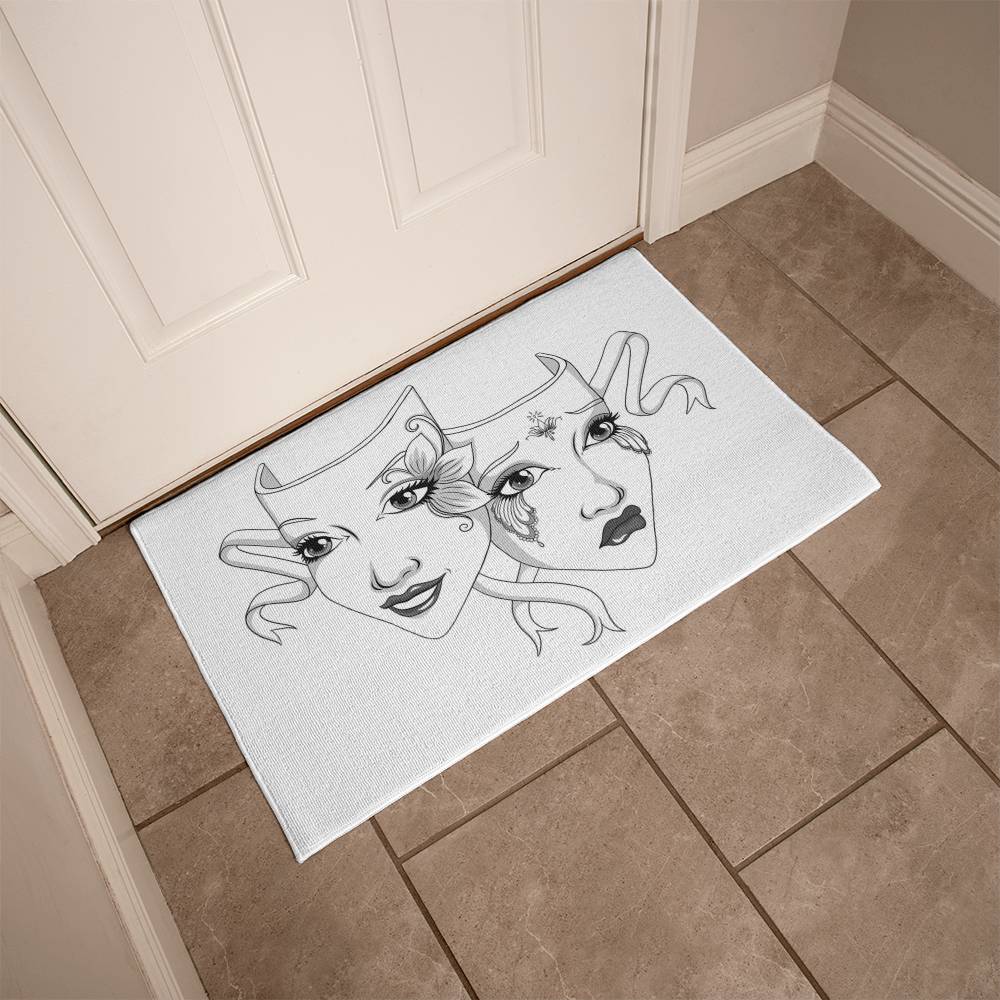 Make your grand entrance unforgettable with our Drama Mask Welcome Mat, inspired by the duality of theatre—the joy and sorrow that lives within every performer. This bold, hand-illustrated design features the timeless comedy and tragedy masks, elevated with feminine, gothic detailing and a clean black-and-white palette.