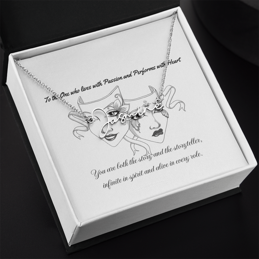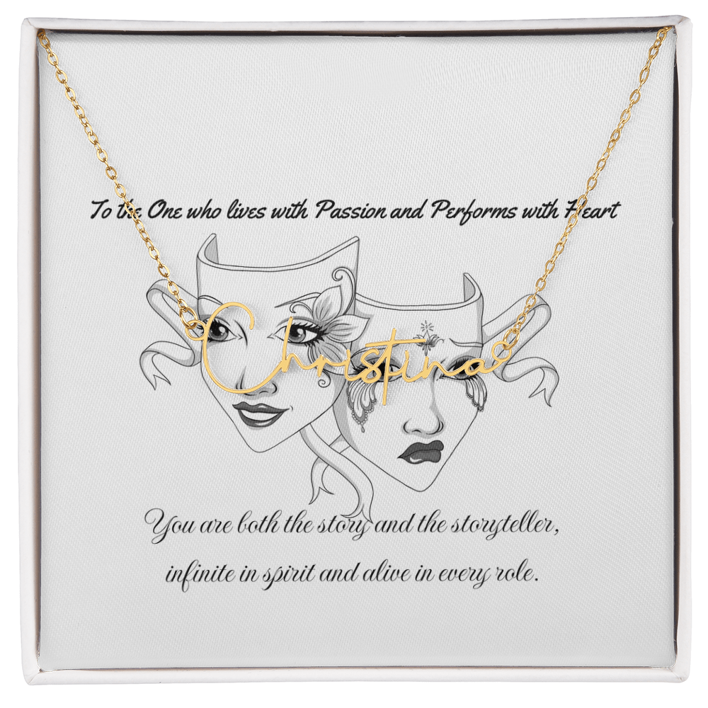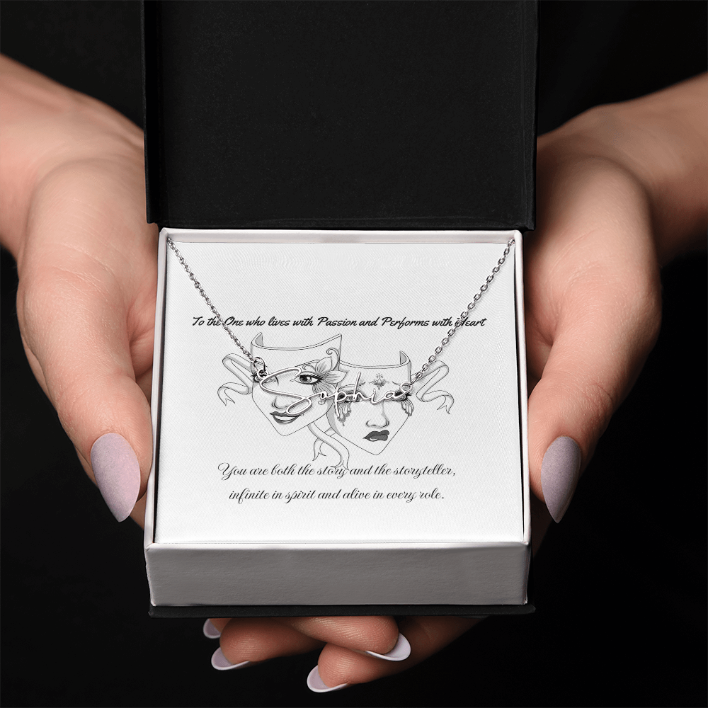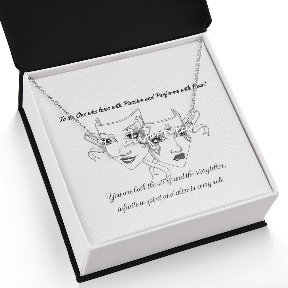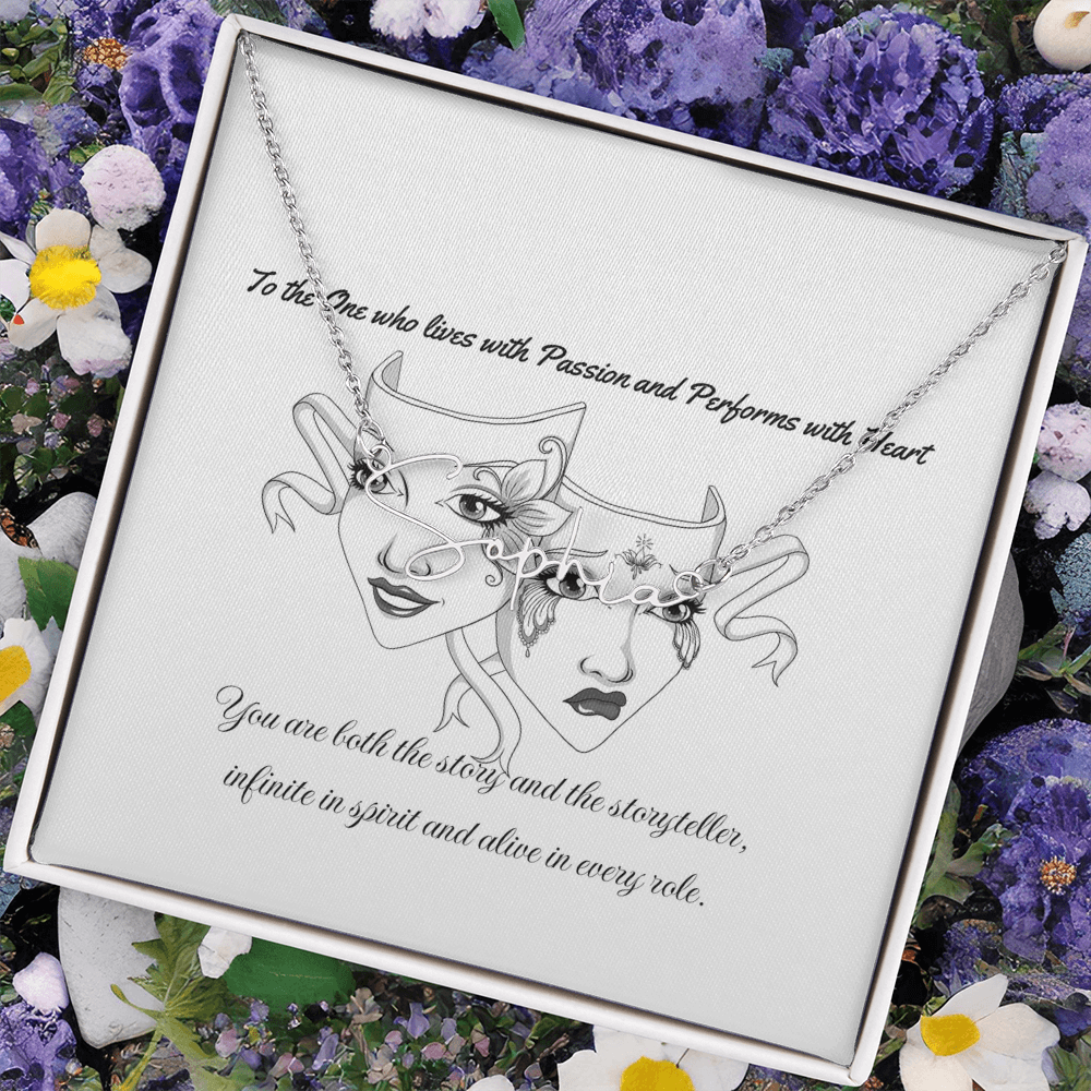 This Signature Style Name Necklace captures the spirit of the theatre—where every mask hides a story and every performance reveals the truth. Featuring your choice of name or word in a modern, stylish font, this personalized necklace is a meaningful gift for actors, performers, theatre moms, or anyone who lives dramatically and loves deeply.