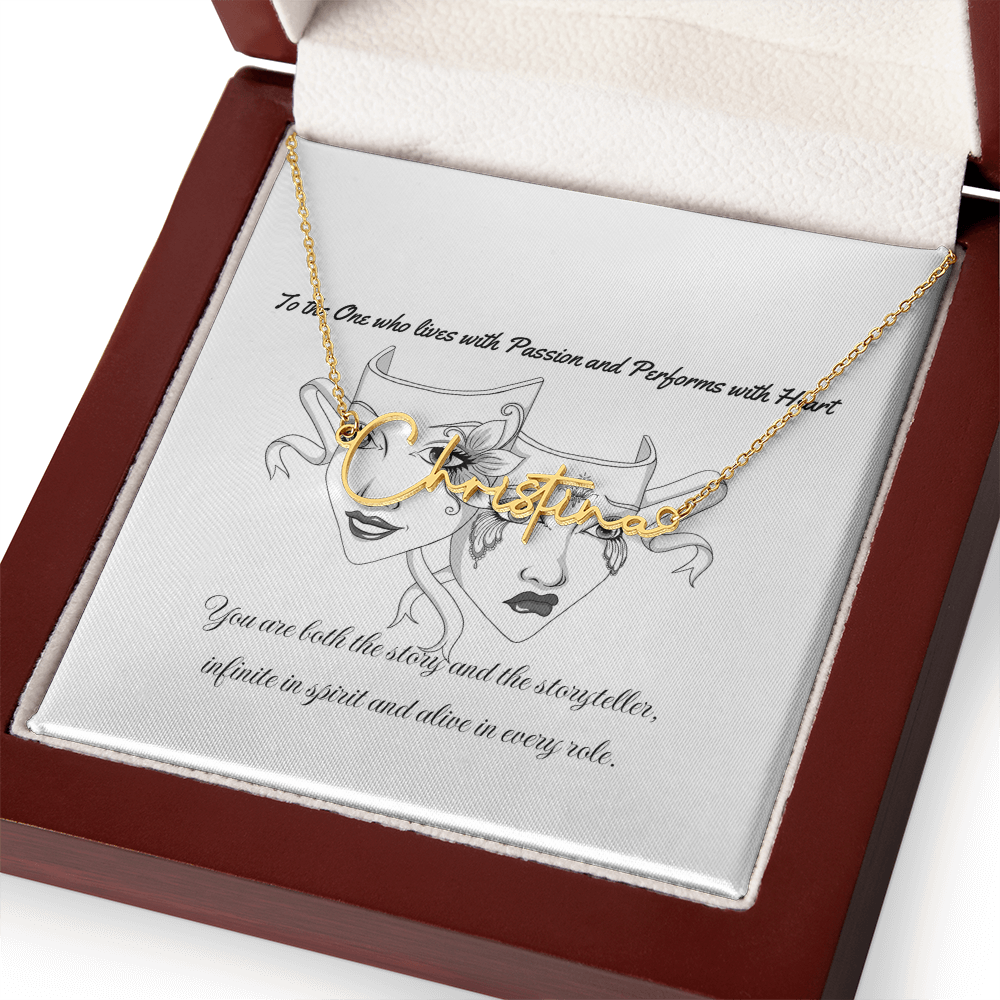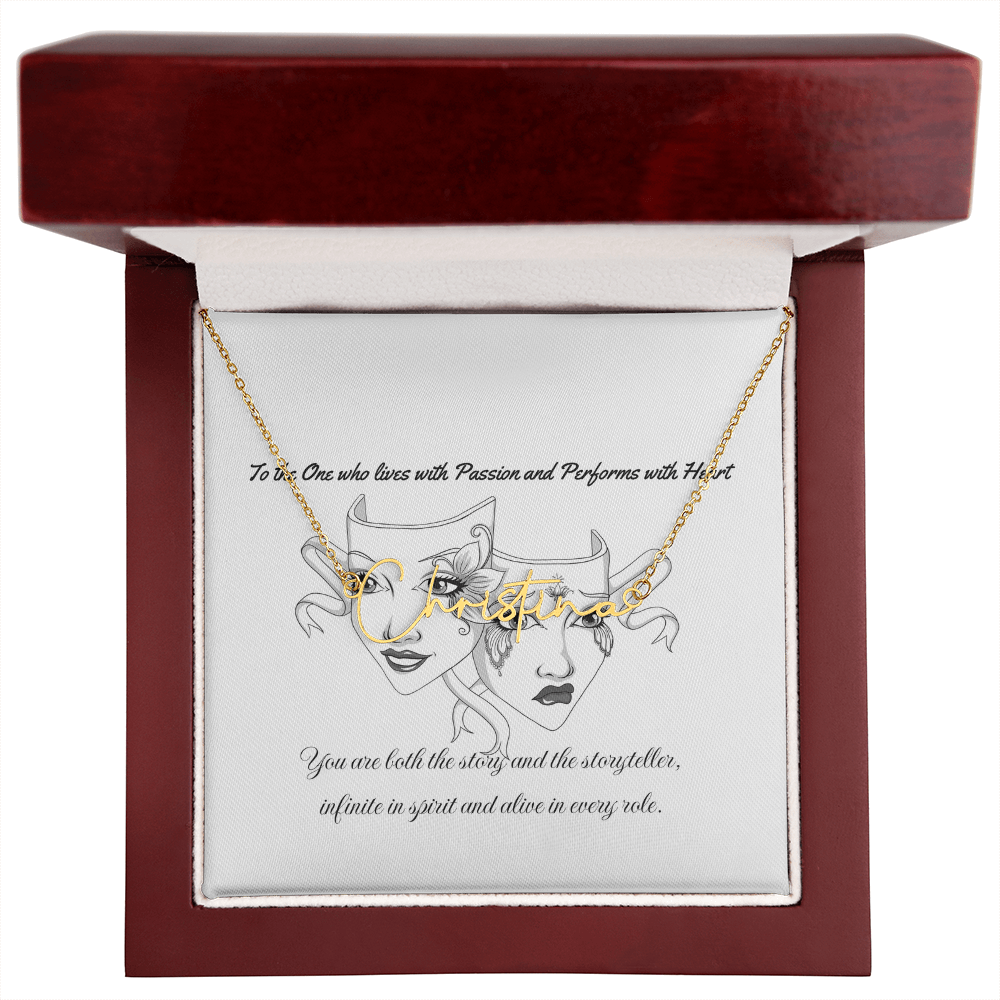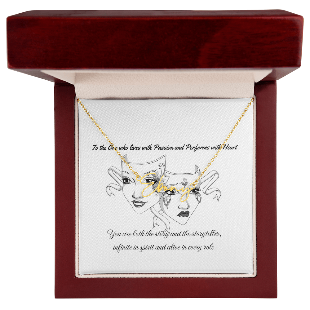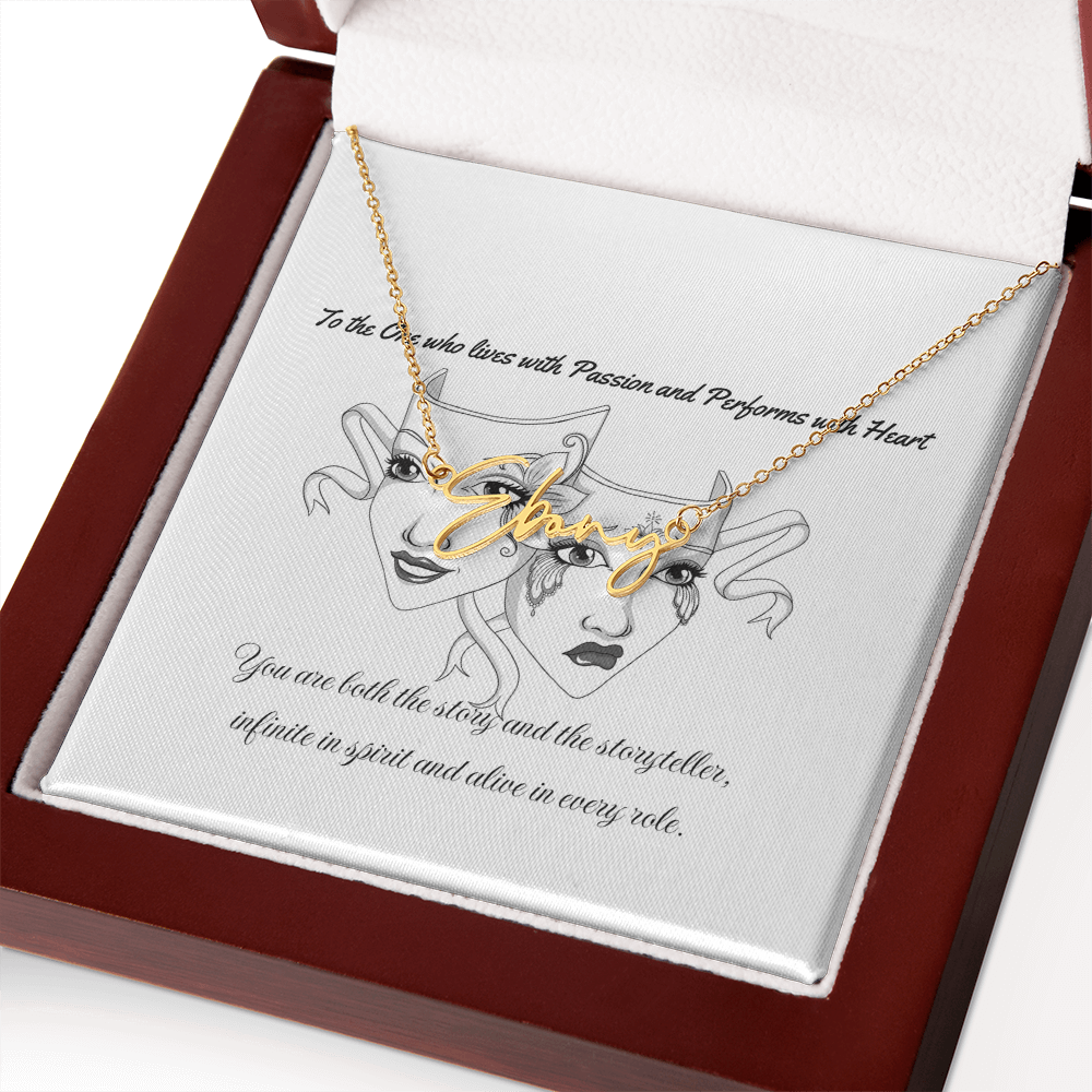 This Signature Style Name Necklace captures the spirit of the theatre—where every mask hides a story and every performance reveals the truth. Featuring your choice of name or word in a modern, stylish font, this personalized necklace is a meaningful gift for actors, performers, theatre moms, or anyone who lives dramatically and loves deeply.