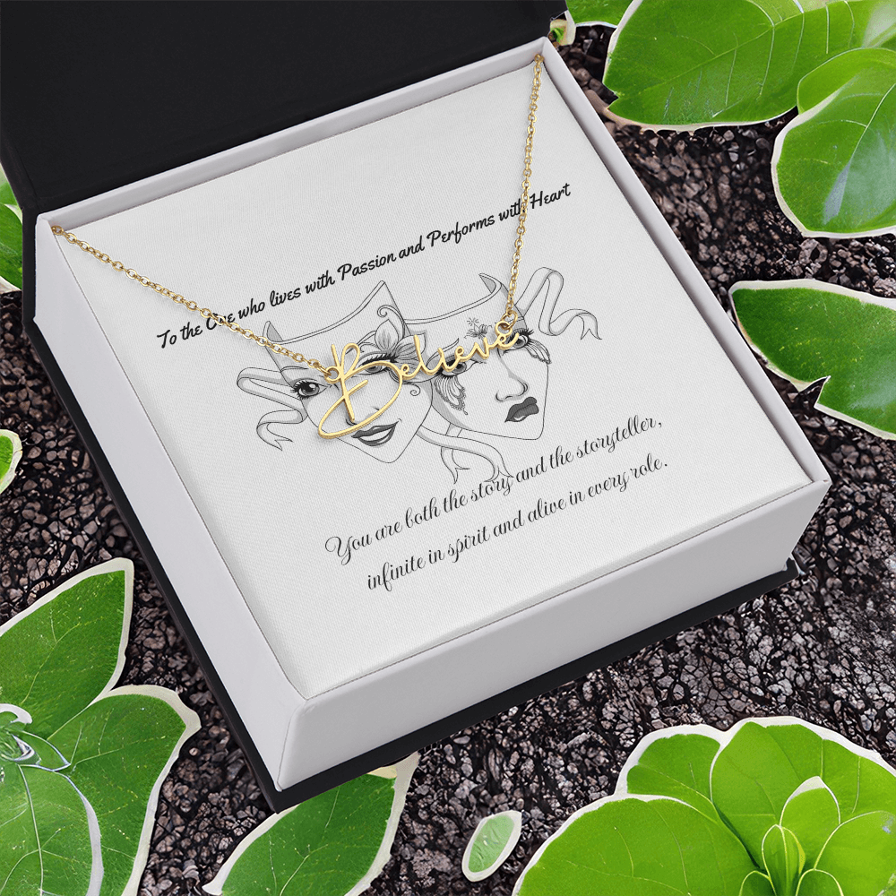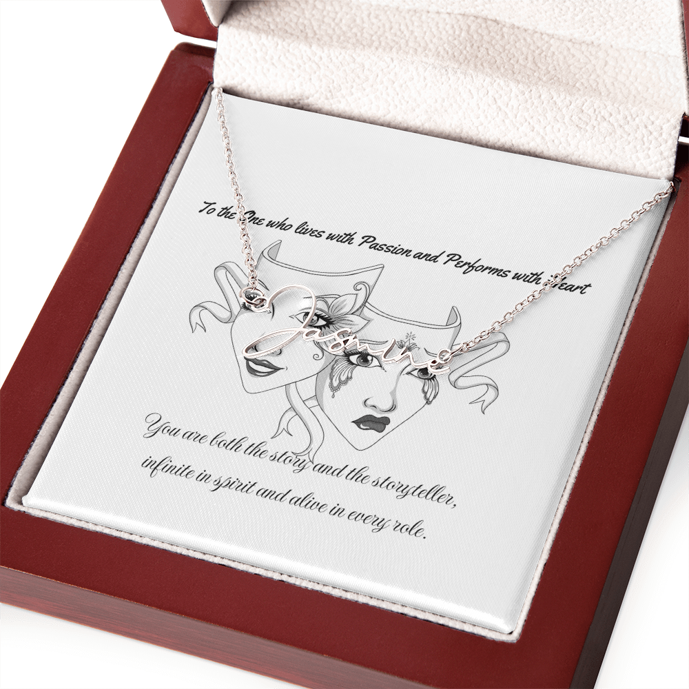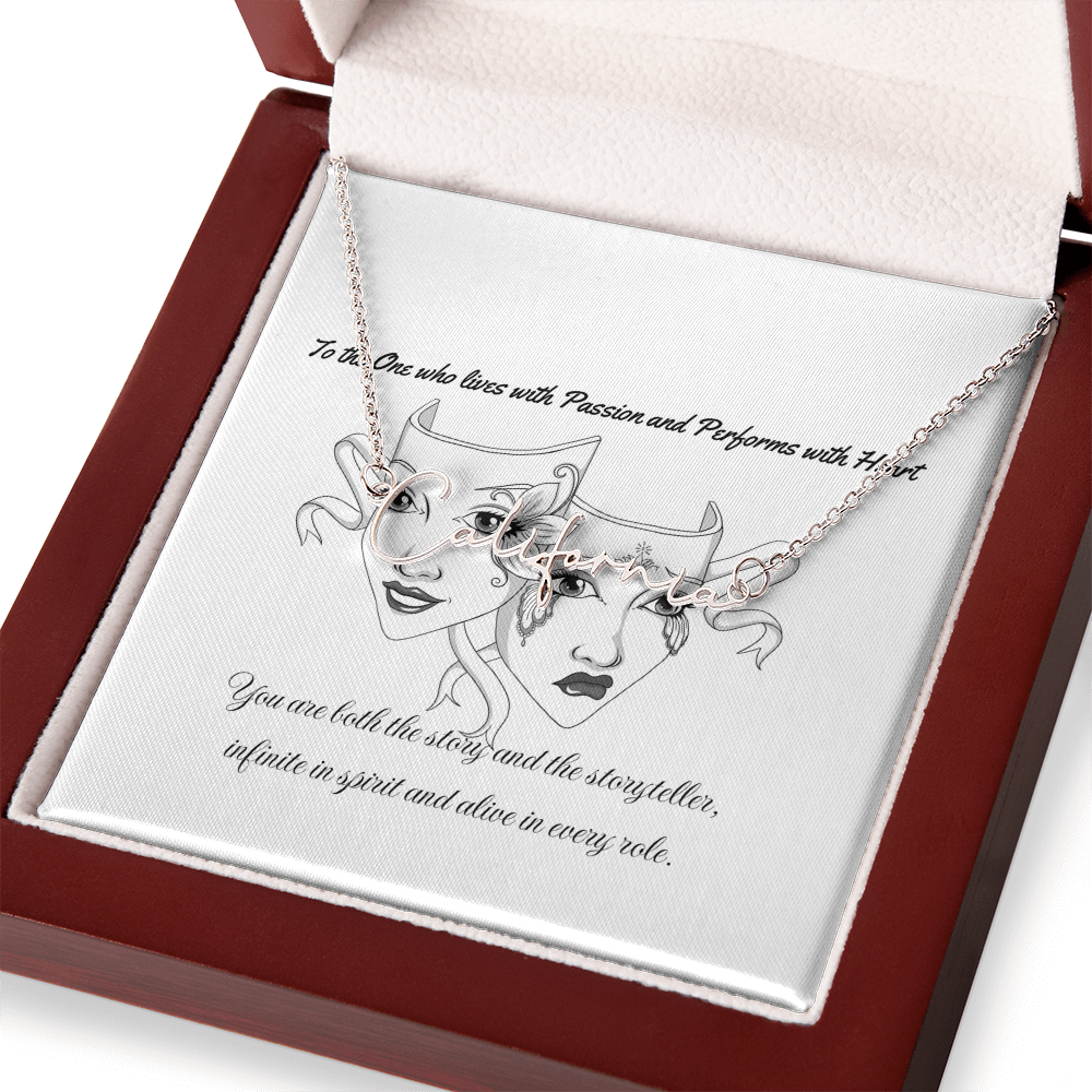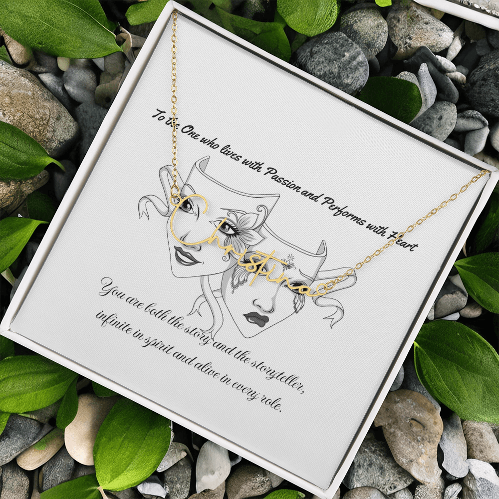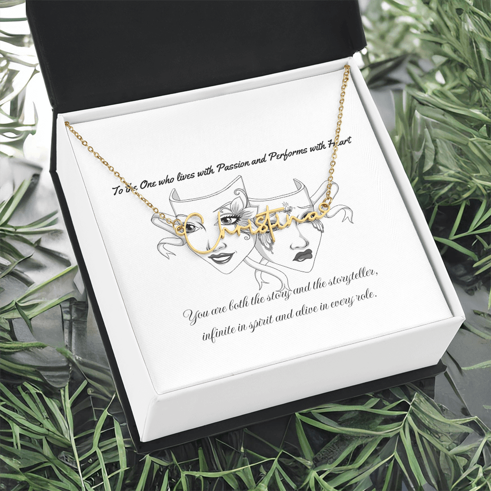 This Signature Style Name Necklace captures the spirit of the theatre—where every mask hides a story and every performance reveals the truth. Featuring your choice of name or word in a modern, stylish font, this personalized necklace is a meaningful gift for actors, performers, theatre moms, or anyone who lives dramatically and loves deeply.