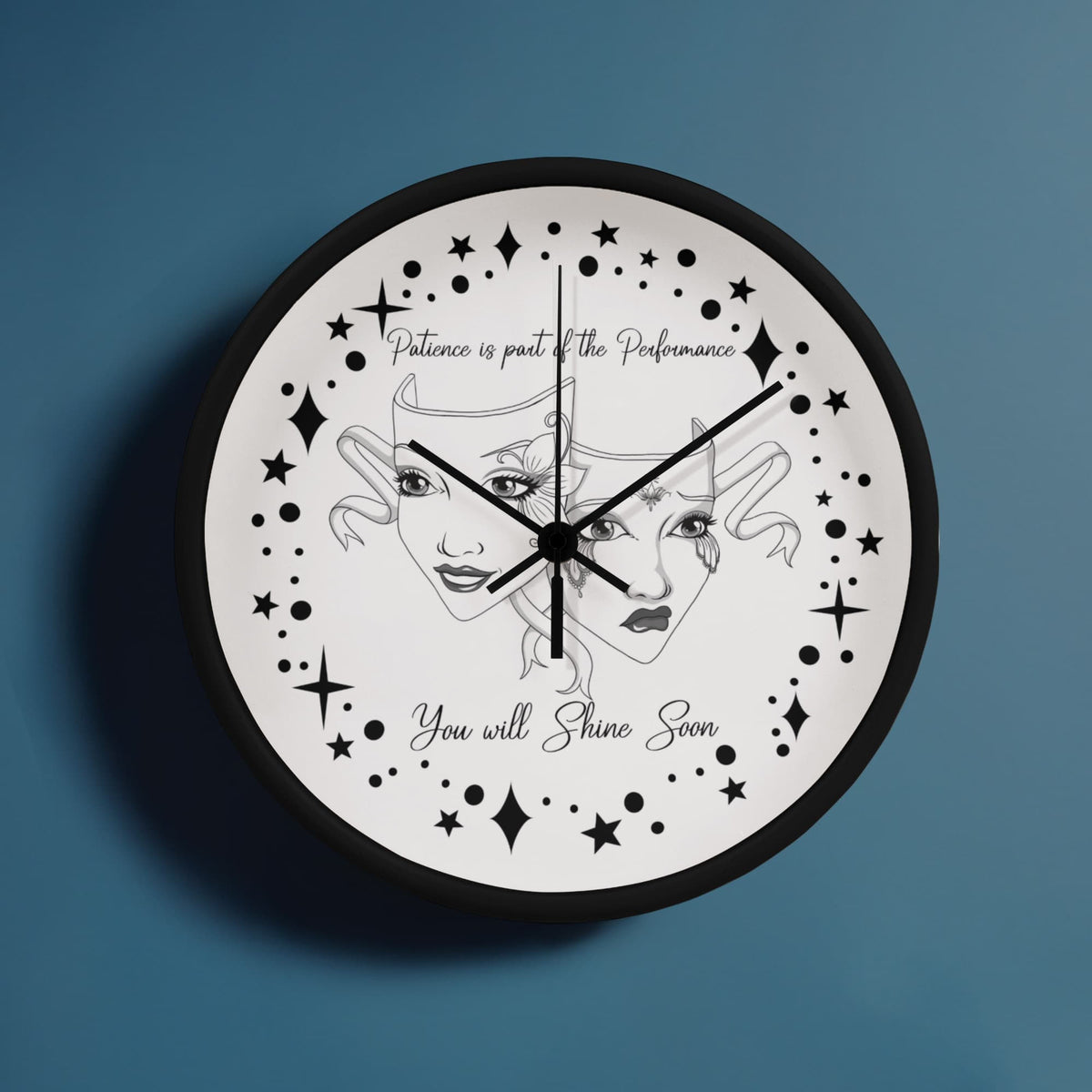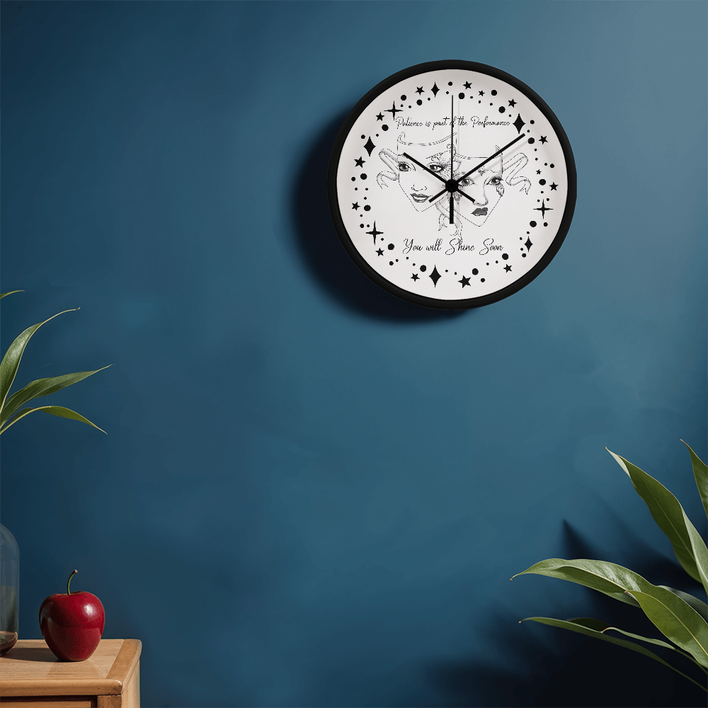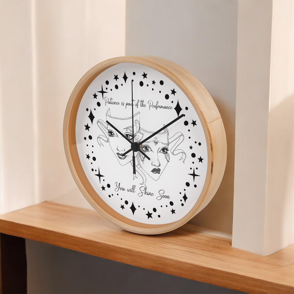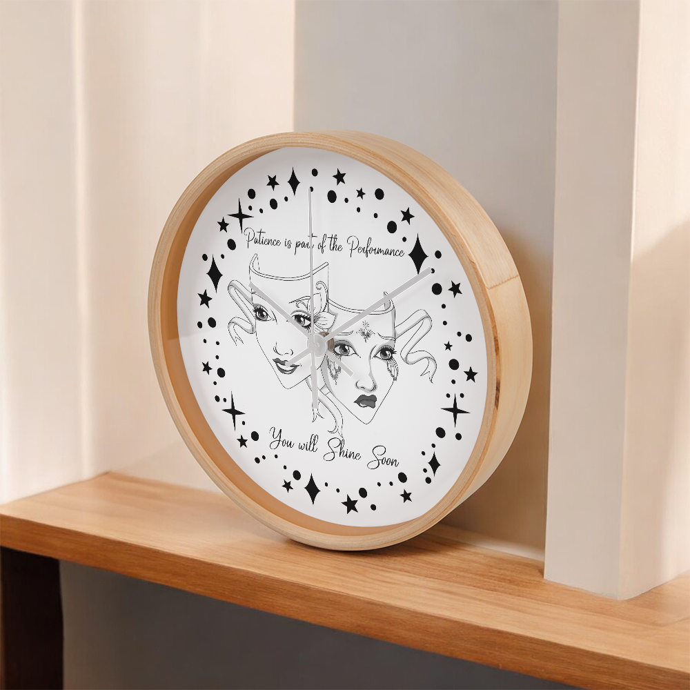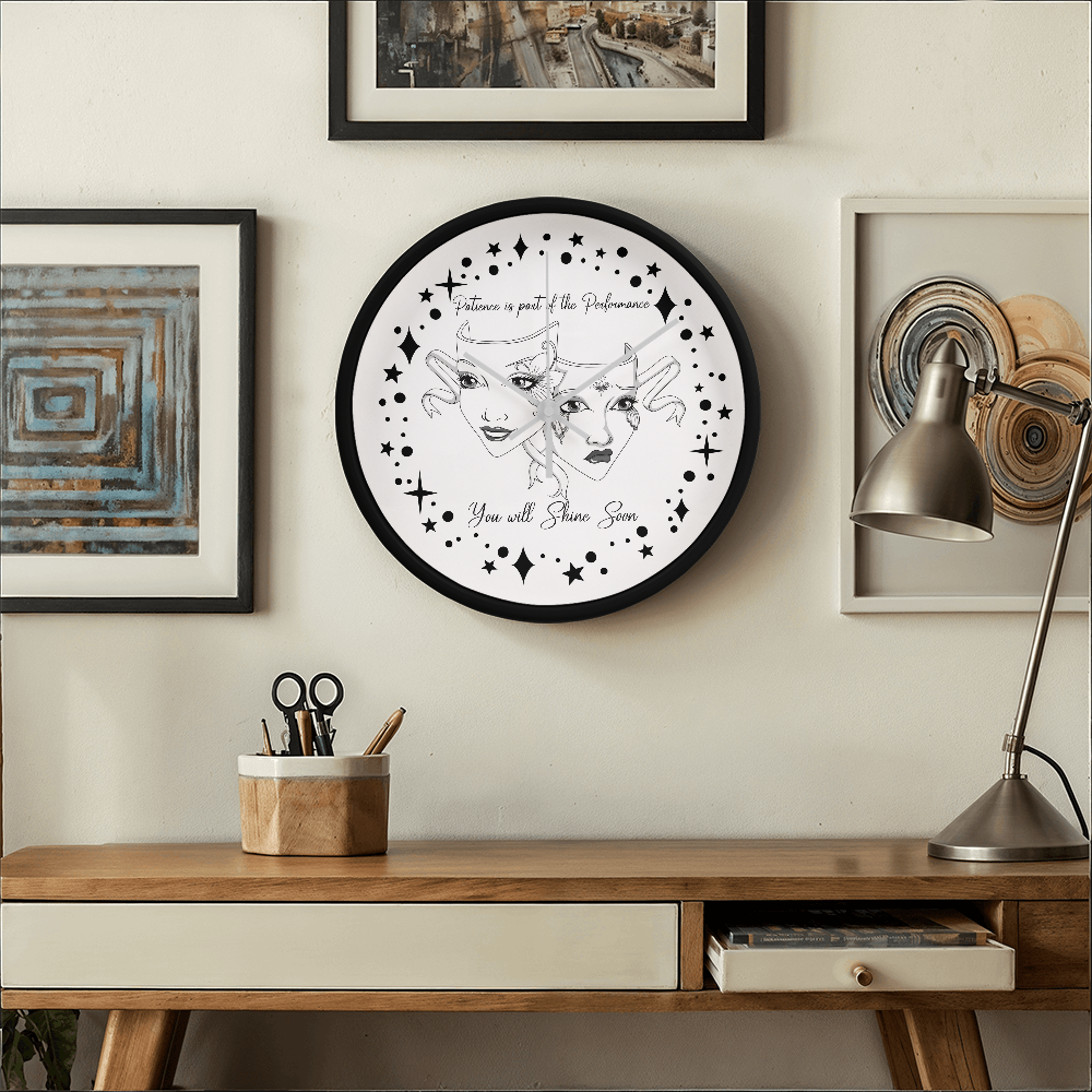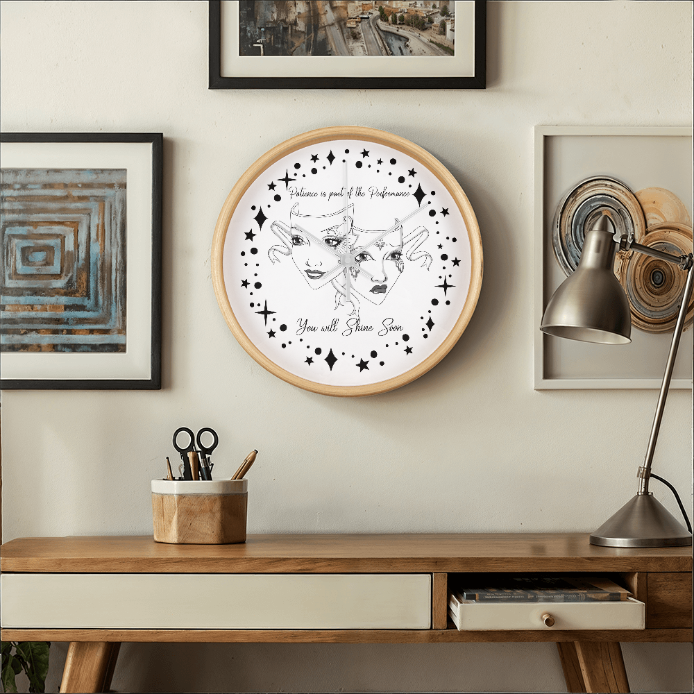 Step into the spotlight — even if you're still waiting in the wings. This “Patience is Part of the Performance” Wall Clock captures the duality of the actor’s journey with a beautifully illustrated set of theatre masks: one joyful and one sorrowful, adorned with ornate face paint and swirling ribbons. Surrounded by a galaxy of stars and the inspiring words"Patience is part of the performance; you will shine soon.", this black-and-white design speaks to the heart of anyone pursuing their passion.