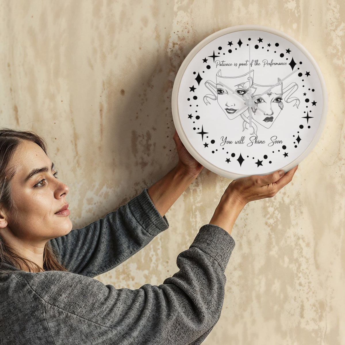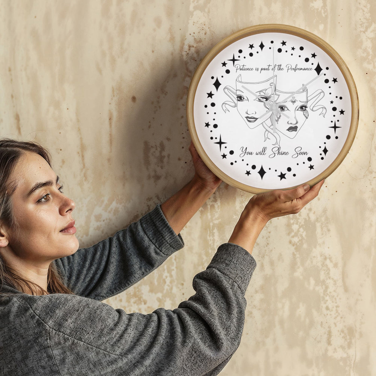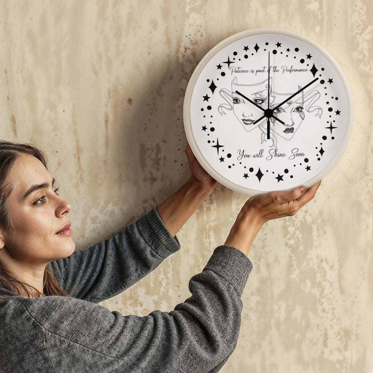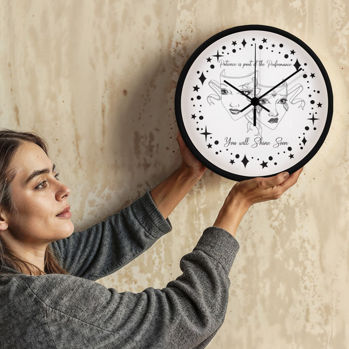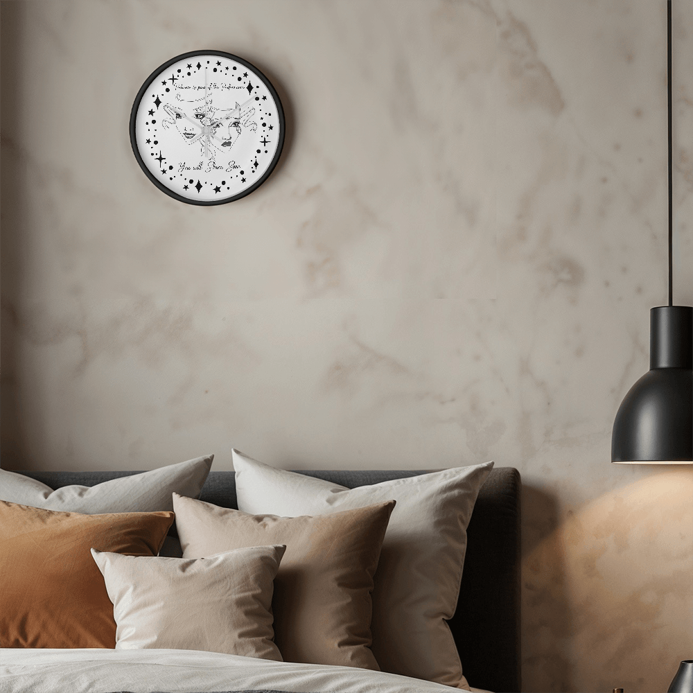 Step into the spotlight — even if you're still waiting in the wings. This “Patience is Part of the Performance” Wall Clock captures the duality of the actor’s journey with a beautifully illustrated set of theatre masks: one joyful and one sorrowful, adorned with ornate face paint and swirling ribbons. Surrounded by a galaxy of stars and the inspiring words"Patience is part of the performance; you will shine soon.", this black-and-white design speaks to the heart of anyone pursuing their passion.