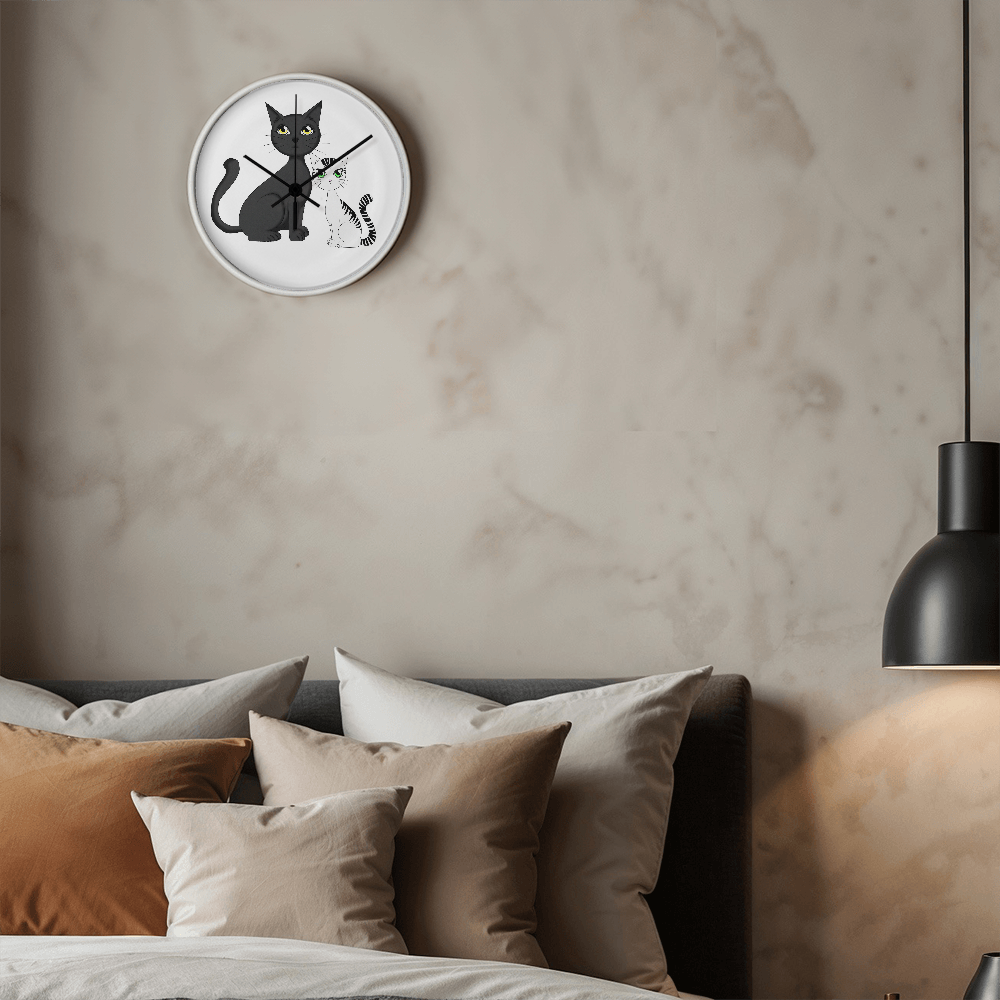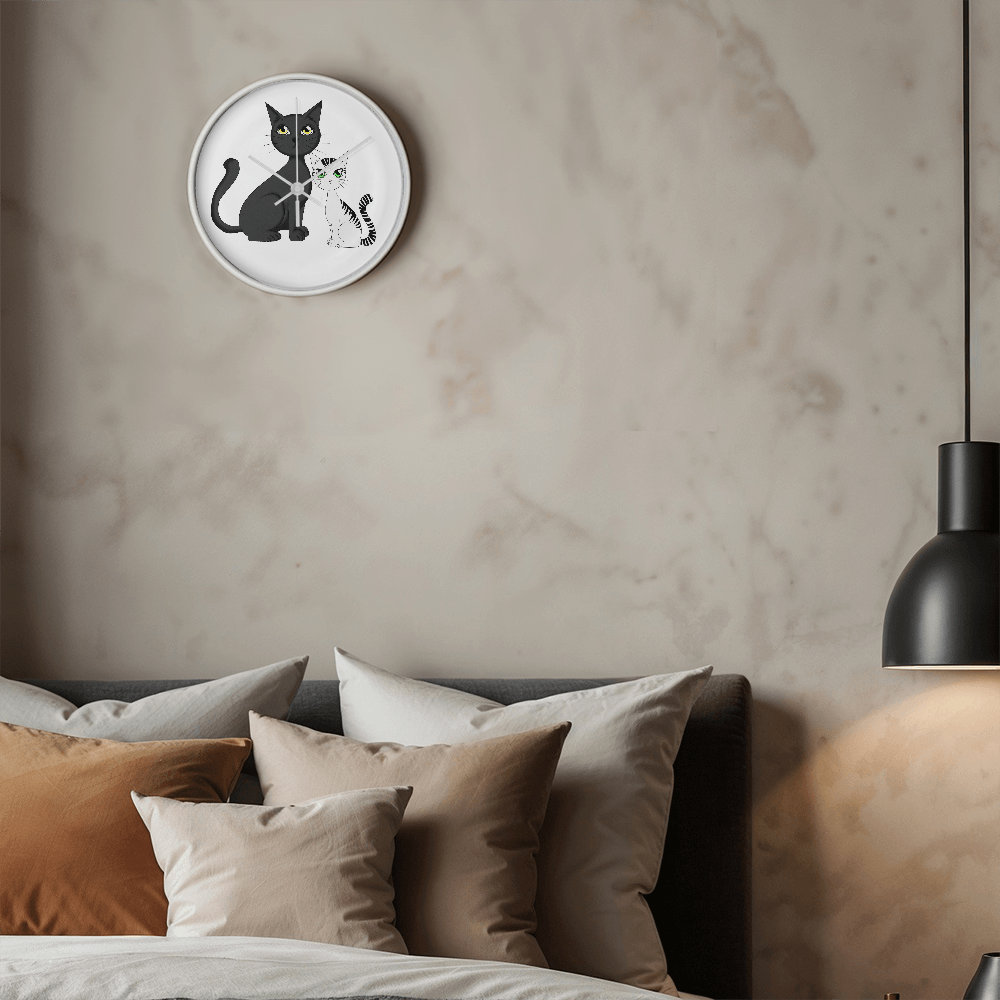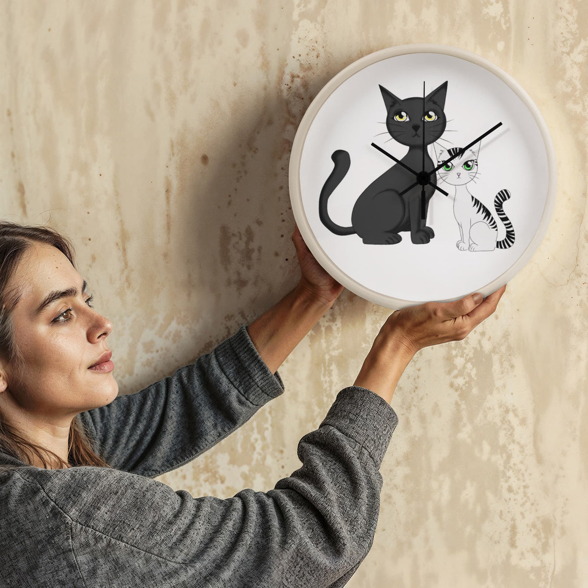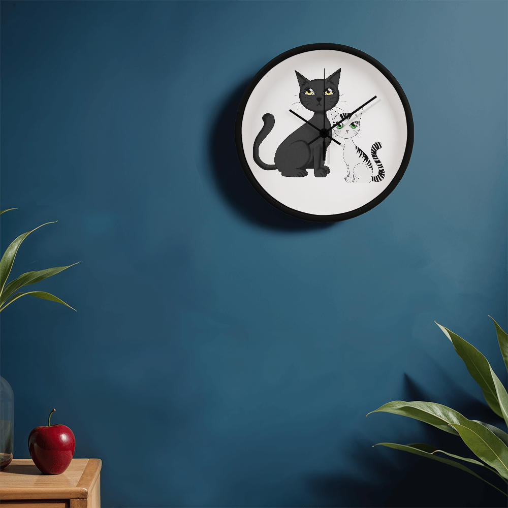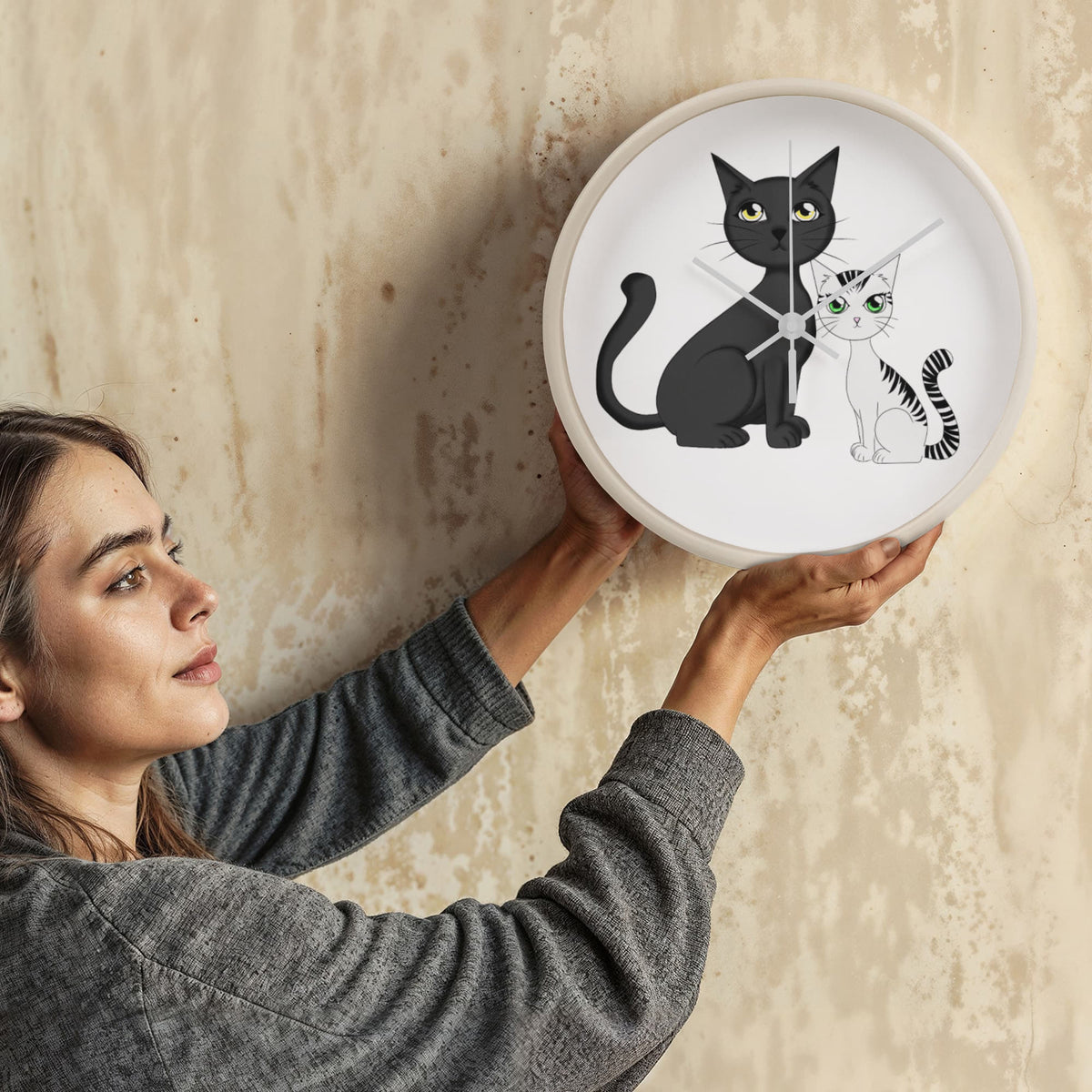 Elevate your wall decor with the Black and White Cat Clock, a sophisticated and artistic timepiece that blends minimalist lines with bold contrast. Featuring two captivating cats—one sleek black with golden eyes, and one fierce white with black tiger-like stripes and vivid green eyes—this clock is a showstopper for any feline fanatic.