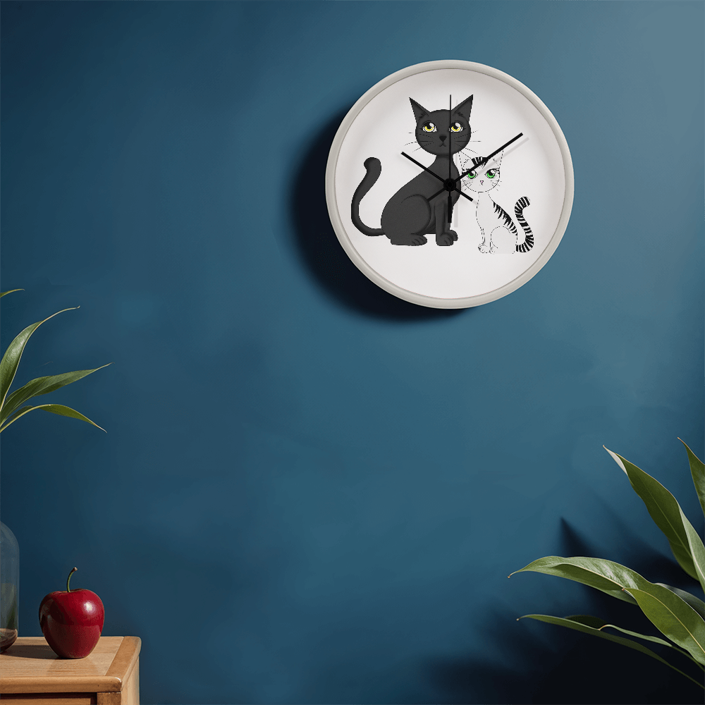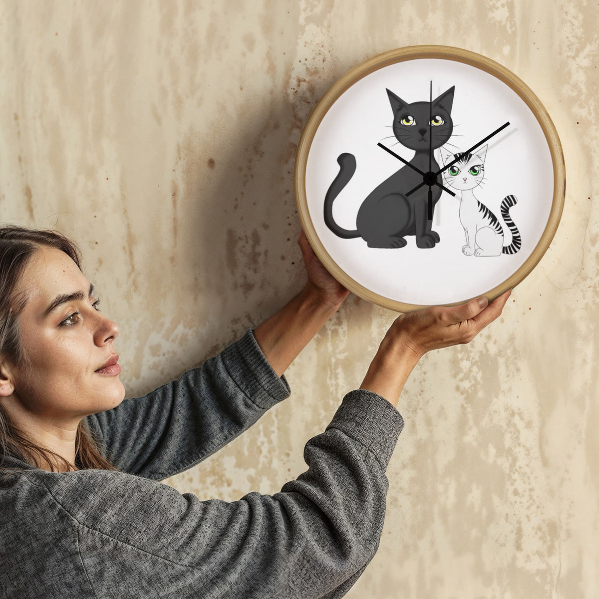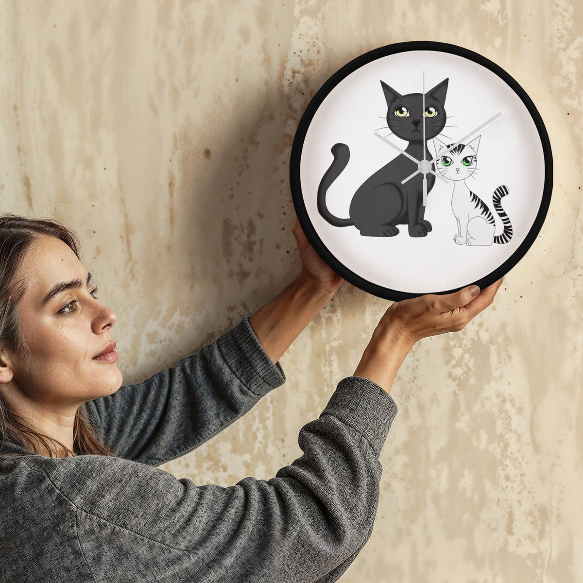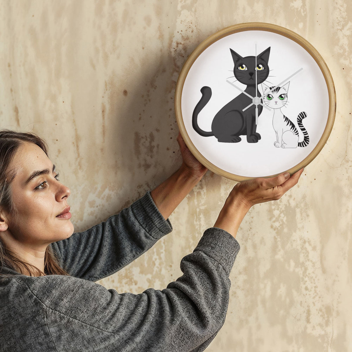 Elevate your wall decor with the Black and White Cat Clock, a sophisticated and artistic timepiece that blends minimalist lines with bold contrast. Featuring two captivating cats—one sleek black with golden eyes, and one fierce white with black tiger-like stripes and vivid green eyes—this clock is a showstopper for any feline fanatic.